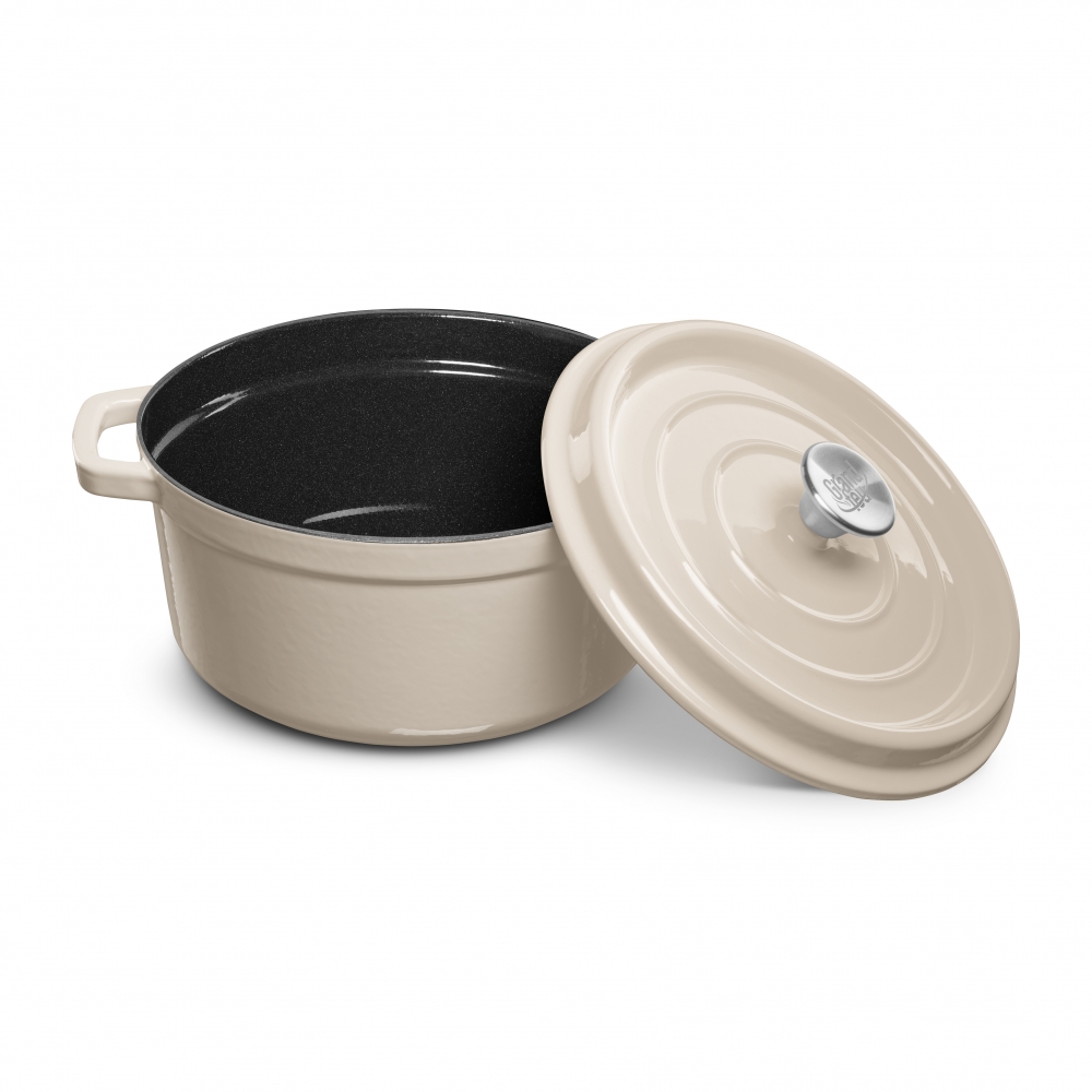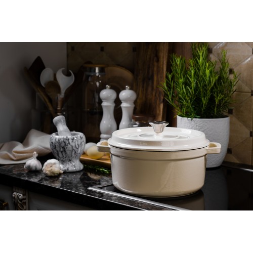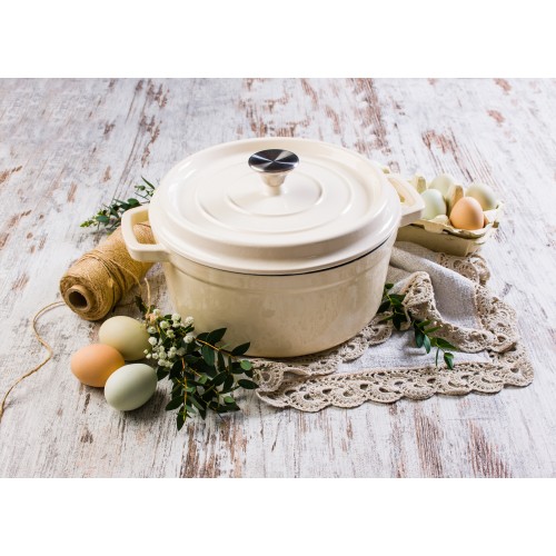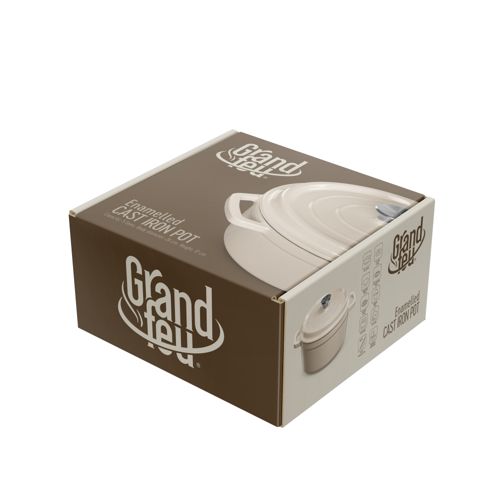 Grandfeu stiilne 4,7-liitrine valge kaanega pott on minimalistliku disainiga ning garanteeritult kauakestev ja vastupidav. Poti kere on valmistatud malmist, kaetud väljast läikiva emailiga ning seest mati emailiga. Matt emailikiht kaitseb sisepinda rooste eest ning aitab samal ajal hoida ära toidu haakumist poti servade külge. Potil on laiad sangad, mida on mugav pajakinnastega tõsta. Pott kuumeneb aeglaselt ning hoiab stabiilselt sooja kuni neli tundi. Talub äärmiselt kõrget temperatuuri – kuni 450 kraadini. Valmista nendes pottides maitsvaimaid putrusid, suppe, kastmeid, hautisi. Potid sobivad ideaalselt ka leiva või kotlettide küpsetamiseks.
